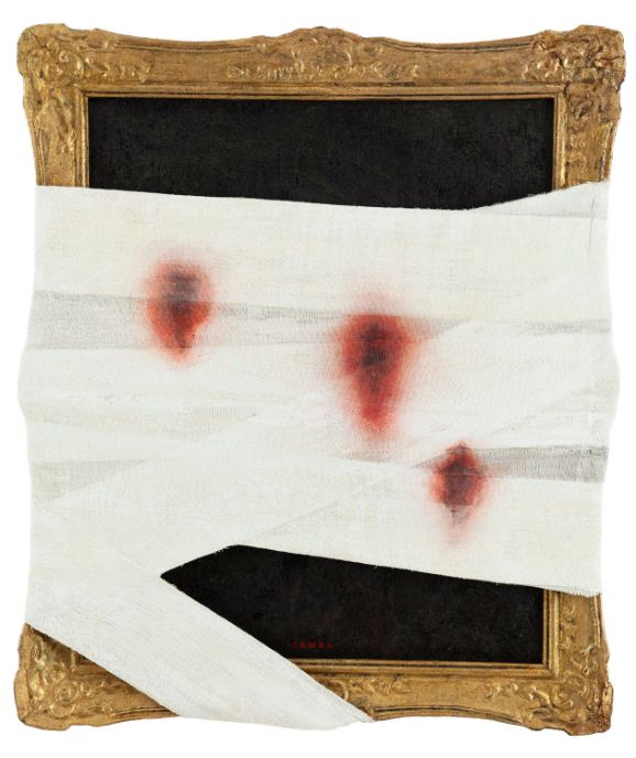 The burned surface of the painting and the inventory number serve as a metaphor for the attempt to comprehend the structure of meaning and to divide the world into “understandable” categories.