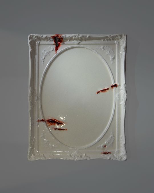 A materialized metaphor for blind violence. The bullet hole. Resin and glass imitate living, "wet" matter, frozen at the moment of impact. "Black blood"—a substance that does not flow, but crystallizes. The "fool" bullet acts blindly, yet it leaves a mark that is impossible to ignore.